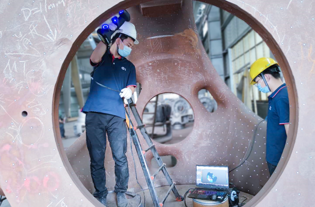 客戶是一家生產(chǎn)風(fēng)力發(fā)電設(shè)備相關(guān)部件的企業(yè),此次掃描檢測的是一個大型風(fēng)機(jī)頭鑄件(直徑約3m),要求數(shù)據(jù)采集完整(包括底部),精度±3mm,主要用于尺寸測量、輸出檢測報告、保存數(shù)據(jù)以及更好地對接客戶。
