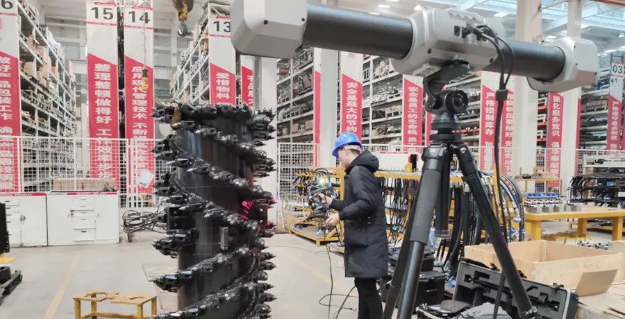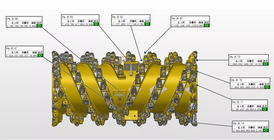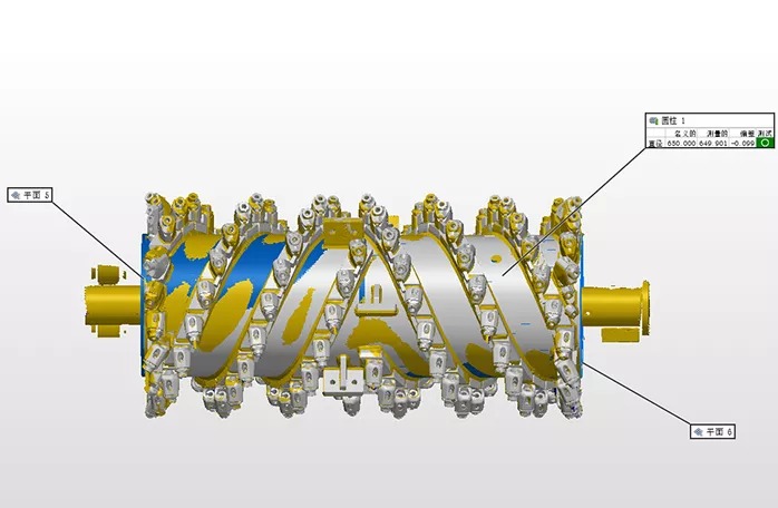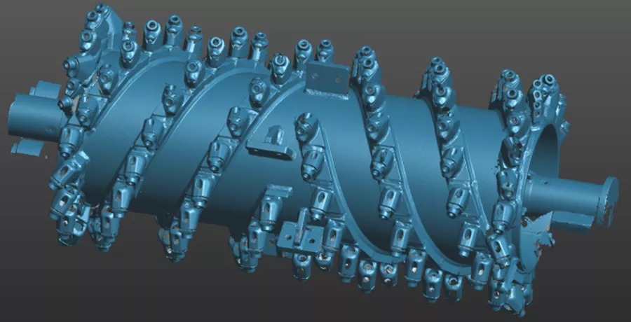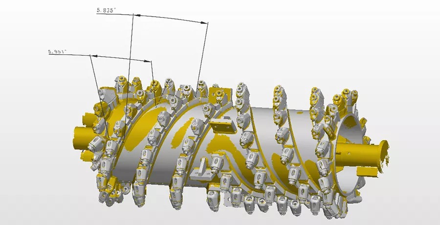 銑刨鼓是道路銑刨機(jī)的核心,需經(jīng)過嚴(yán)格的檢測(cè),以避免磨損以及變形的負(fù)荷縮短設(shè)備使用壽命。過去采用接觸式打點(diǎn)來進(jìn)行檢測(cè),不但測(cè)量速度慢,而且測(cè)量死角多,測(cè)量數(shù)據(jù)不全,且銑刨鼓的刀頭為活動(dòng)刀頭,裝配后測(cè)量無法測(cè)得準(zhǔn)確的刀頭點(diǎn)位。