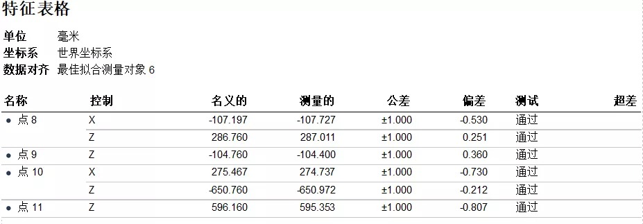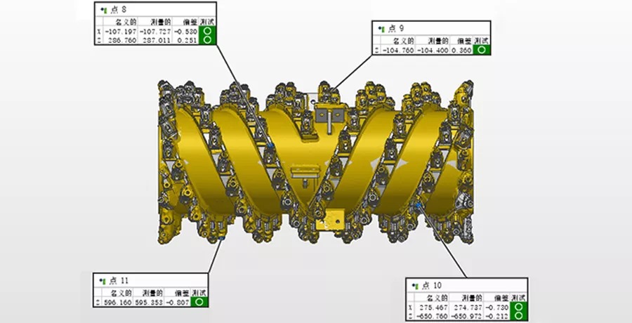 利用銑刨鼓兩端面、筒身特征約束XYZ平移自由度;點(diǎn)8、9、10、11四點(diǎn)約束YZ方向旋轉(zhuǎn)自由度。最后將掃描數(shù)據(jù)與CAD數(shù)模實(shí)現(xiàn)完全約束。(點(diǎn)8、9、10、11的單點(diǎn)偏差分別如下圖所示)